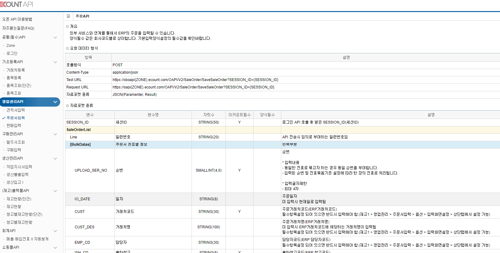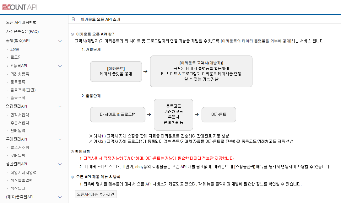 ERP API에 대한 메뉴얼 형식으로 되어있는데, 최초 인증키를 발급받아야 접근할 수 있습니다.